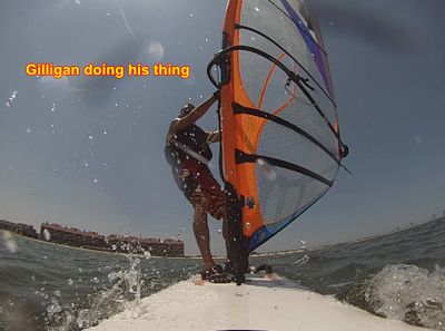 This is the hardest balance to learn for beginners. It means that we have to balance ourselves against the wind. While powering up slowly, allow the power to dissipate through the mast foot to the board, pushing the board, thus reducing the power, allowing for more powering up. All the while, raking the balanced rig over the wind. A well balanced rig can be left alone for a second or so, while it floats on the wind. When the wind gets strong, it will be providing enough power to let the sailor hang on the rig, helping to balance the rig against the wind